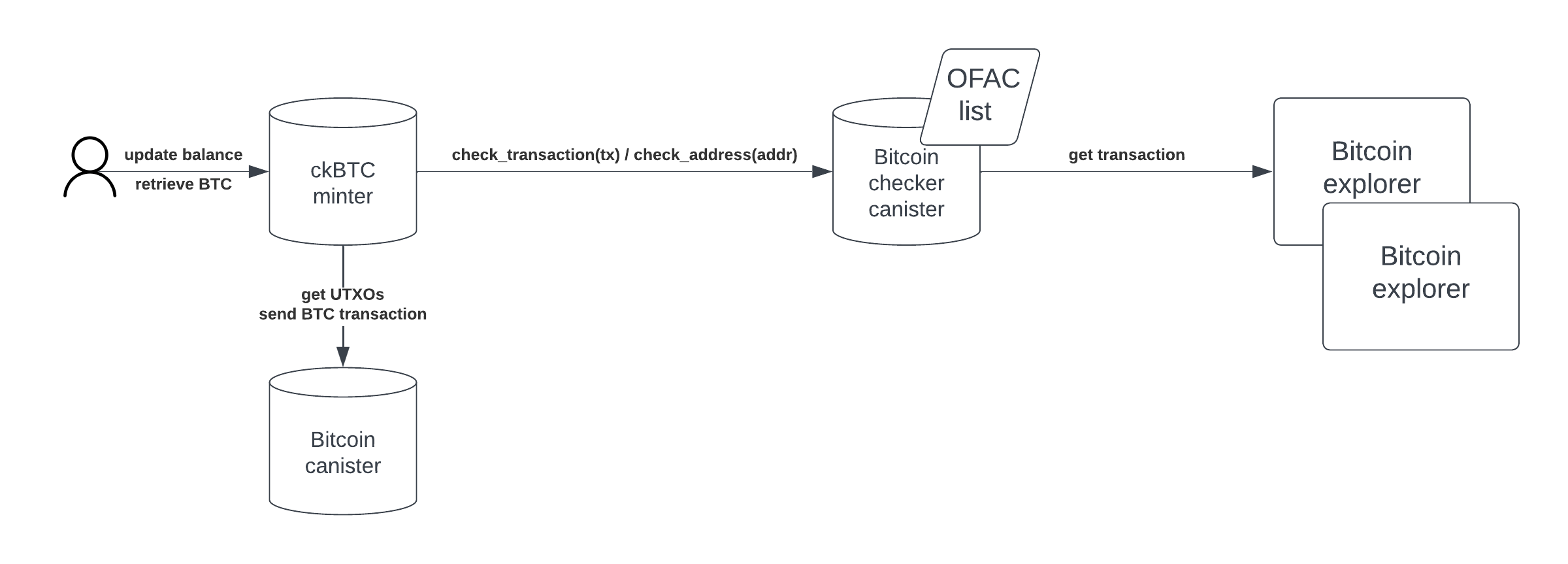 The following figure shows a high-level overview of how the ckBTC minter interacts with the Bitcoin checker canister. When a user deposits or wishes to withdraw bitcoin, the ckBTC minter sends a request to the Bitcoin checker canister, which in turn checks the involved Bitcoin addresses against the Specially Designated Nationals (SDN) list of the OFAC. If there is a hit, the check is considered Failed. When receiving the response Failed, the actions of the ckBTC minter depend on the type of request.