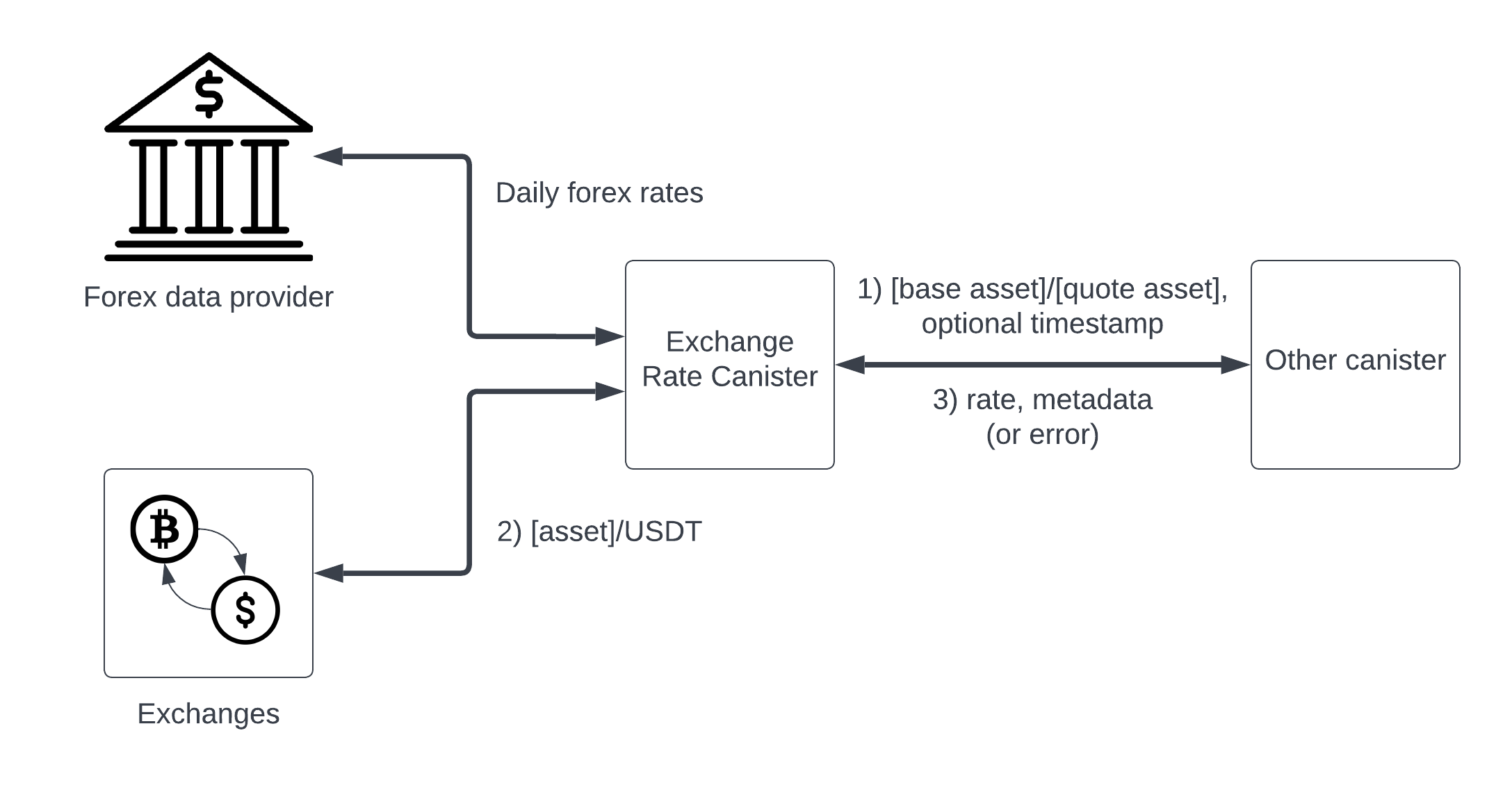 The exchange rate canister (XRC) is a canister running on the uzr34 system subnet that provides exchange rates to requesting canisters. A request comprises a base asset, a quote asset, and an optional (UNIX epoch) timestamp. The base and quote asset can be any combination of cryptocurrency and fiat currency assets, for example, BTC/ICP, ICP/USD, or USD/EUR. The timestamp parameter makes it possible to request historic rates. If no timestamp is provided in the request, the rate for the current time is returned.